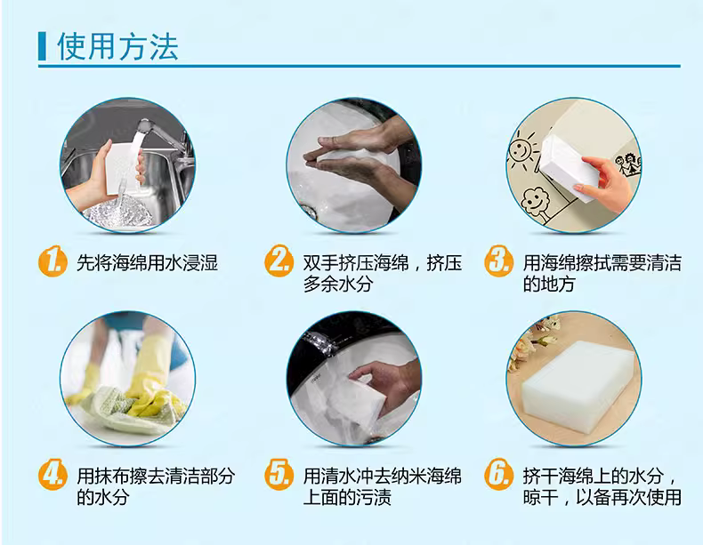注意事項(xiàng):對(duì)于皮革類產(chǎn)品,納米海綿使用在真皮上效果明顯,人造革稍次。由于納米海綿的吸附能力非常強(qiáng),容易掉色或者染色過(guò)的皮革類產(chǎn)品先在不起眼的地方試擦一下,效果可以則大面積使用。